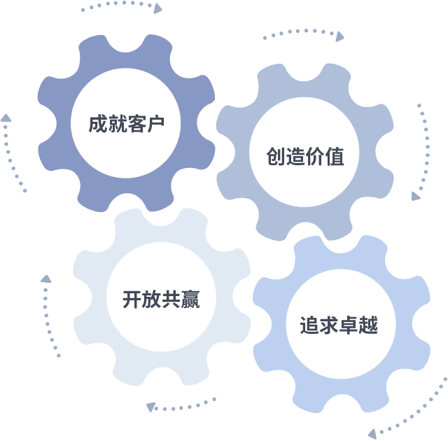 成就客户是一切决策的出发点,,,,创造价值是衡量所有工作的标准,,,追求卓越是我们做事做人的态度,,,开放共赢是我们的格局也是最终的结果。。。。价值观的齿轮环环相扣,,,,推动着组织里的每个人不断向前。。。