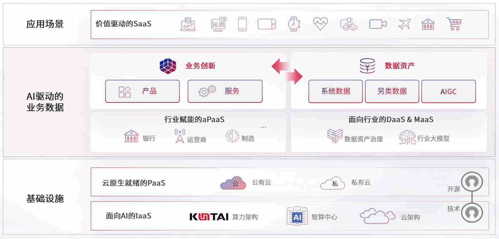 数字时代,,,,围绕企业数字化转型的关键要素,,AG尊龙凯时数码开创性的提出数云融合战略和技术体系框架,,,着力在云原生、、数字原生、、、AI原生和信创产业上架构产品和服务能力,,,,为处在不同数字化转型阶段的快消零售、、、、汽车、、、、金融、、医疗、、、、政企、、、教育、、、、运营商等行业客户提供泛在的敏捷IT能力和融合的数据驱动能力,,,构建跨界融合创新的数字业务场景和新业务模式,,,助力企业级客户建立面向未来的核心能力和竞争优势,,全面推动社会的数字化、、、智能化转型升级。。