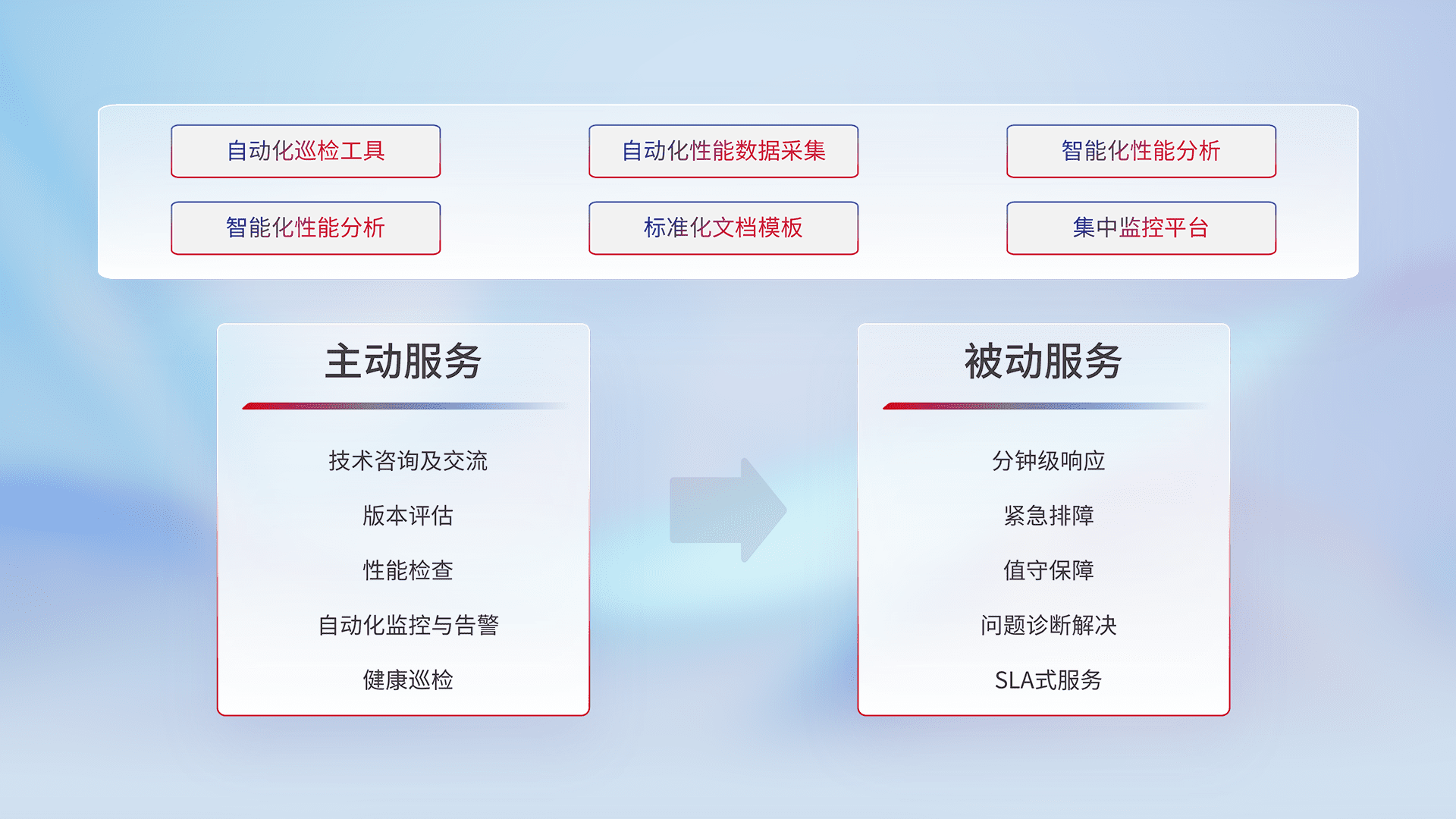 智能化工具和标准化文档,,,保障服务质量,,,,提供主动服务(包含技术咨询、、、、版本评估、、、、性能检查、、、、自动化监控与告警、、、健康巡检)和被动服务包含(分钟级响应、、、紧急排障、、、值守保障、、、问题诊断解决、、、SLA服务)。。。