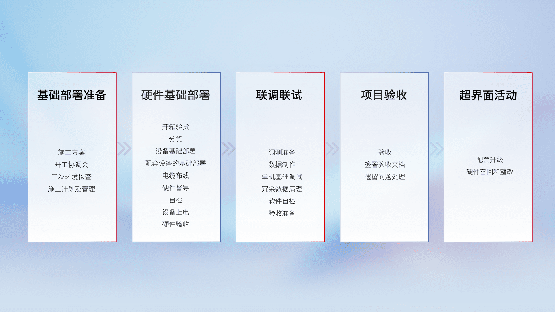 从基础部署准备、、、硬件基础部署、、、、联调联试、、、、项目验收、、、、越界面活动的全过程可追溯,,,,保证施工质量和进度。。。。